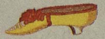 Detail of shoe [color enhanced to show detail] from portrait of Mademoiselle Rosalie Duthé (c. 1792) by Henri-Pierre Danloux (Staaliche Kunsthalle, Karlsruhe). The stockings have an unusual clock of yellow and white. The toe of the shoe appears to be more blunt than other shoes of the period. Compare to the French shoes of 1790, above. The heel is much lower. There is some faint suggestion of trim on the toe. |