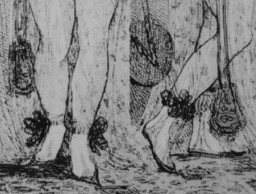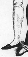 ![]() | Detail, English Caricature, 1800. Note the clocks on the ankles of the stockings (faint here) and the elaborate ribbon. Both are designed to highlight the ankle which was a provocative erotic sight for men at the time. "Well turned ankles" were considered highly desirable. |