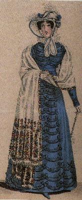 Costume Parisiens, 1822, plate no. 2063. The waist-line has already begun to drop towards a more natural one. The heavy braiding on the blue redingote is in the military style. The bonnet is fairly deep and made of white straw. It is decorated with flowers, ribbon, and feathers. The Elizabethan ruff is still popular, but it is fuller now and extends out further from the neck. A white cashmere shawl covers the lady's shoulders. |
